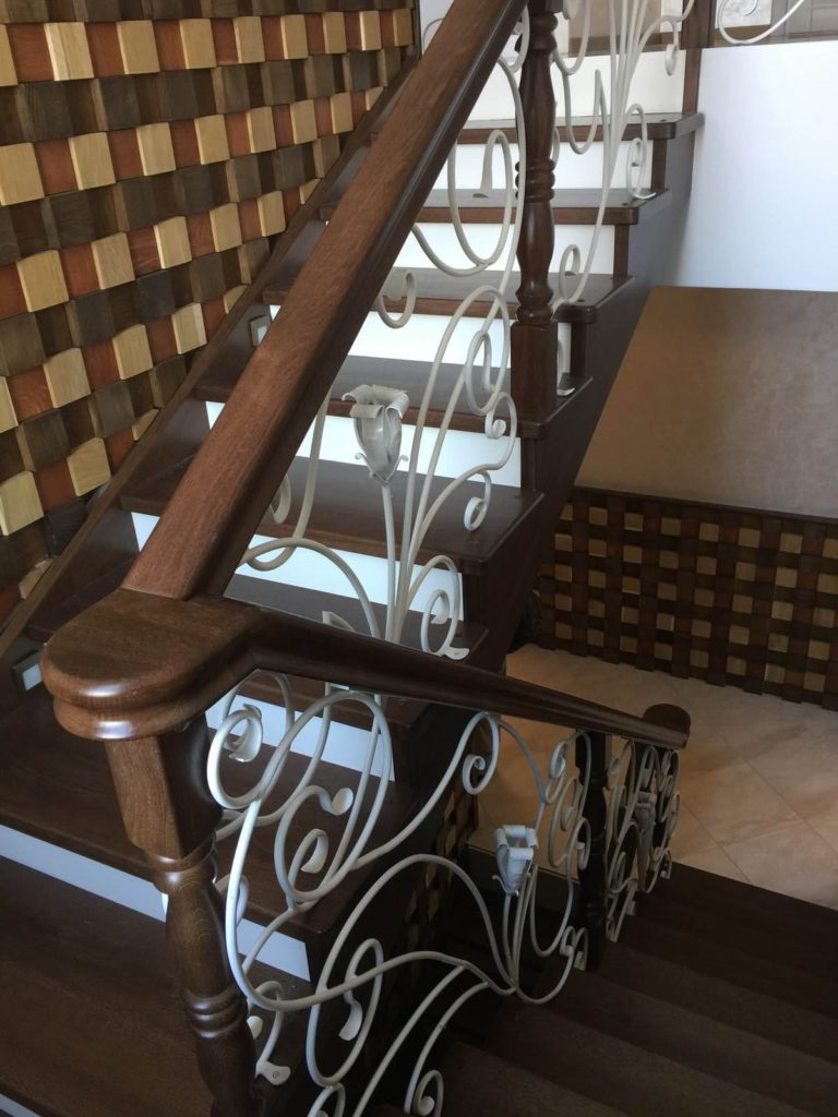 Die Geländer haben geschmiedete Komponenten, die die gesamte Struktur schmücken. Es sollte auch beachtet werden, dass die Stufen aus Holz bestehen, was das Heben erleichtert. Auf Wunsch wird das Material der Stufen individuell vom Kunden ausgewählt.Die Größe des Modells kann auch in Abhängigkeit von der Anzahl der Stockwerke gewählt werden.