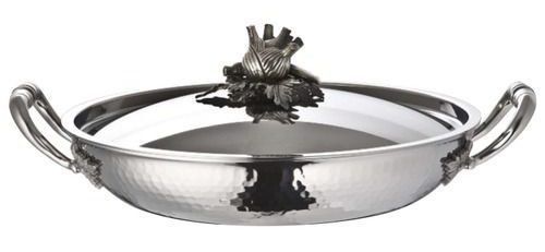 Eine unglaublich schöne Paellapfanne wird Kennern nicht nur Funktionalität und Qualität, sondern auch einen schönen Frühlingslook gefallen. Das wichtigste "Highlight" des Produkts ist die Designarbeit mit dem Markenzeichen des Meisters in Form eines ungewöhnlichen Griffs aus versilbertem Messing, der sich auf dem Deckel befindet.