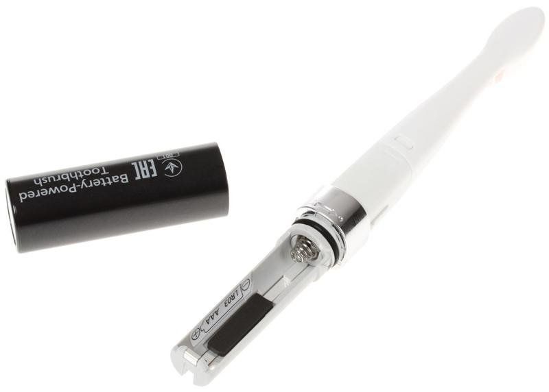 Das Gerät wird mit einer einzigen AAA-Batterie betrieben. Der EW-DS90 wird mit einer Schutzkappe geliefert, die ihn wie einen Lippenstift aussehen lässt. Diese Kappe hilft beim Einsatz der Elektrobürste unterwegs. Ein solches Gerät ist praktisch auf Reisen, da es über eine autonome Stromversorgung verfügt und kompakt ist.