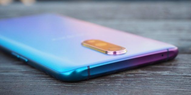 Am auffälligsten an dem Modell ist die Rückseite des Smartphones. Auf der Oberseite befindet sich ein Glas, das im 3D-Format wunderschön im Licht schimmert. Aber das ist nicht alles.Darauf wird eine Beschichtung aufgetragen, die das Vorhandensein eines Gradienten über die gesamte Zusammensetzung erzeugt. Das Panel ist mit drei Farben bedeckt, deren Helligkeit und Farbton vom Neigungswinkel und Sonneneinfall abhängt. Sie können warm oder kalt sein. Wenn Sie zum ersten Mal ein Smartphone in die Hand nehmen und die Rückseite sehen, werden Sie keine anderen Telefone mehr ansehen wollen. Weil Sie ein großes ästhetisches Vergnügen haben werden.