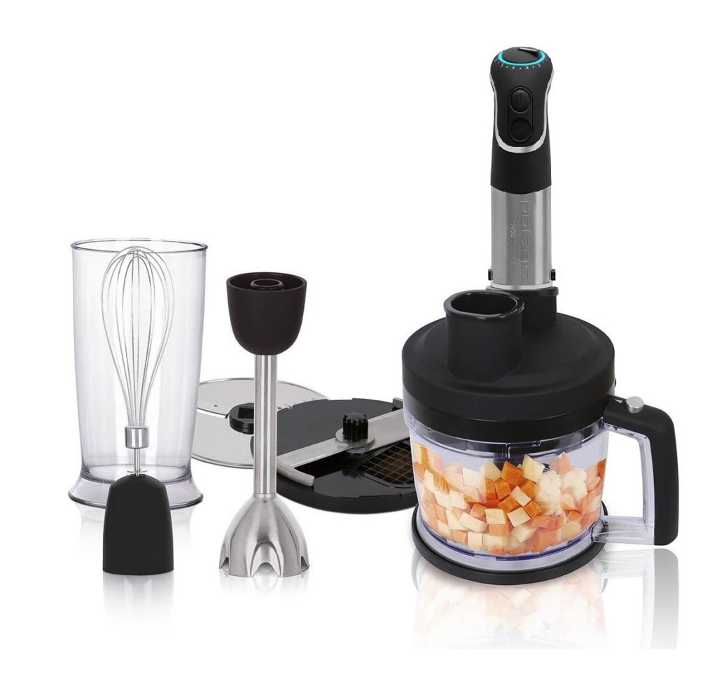 Ein ziemlich teures tragbares Küchengerät. Aber es gibt Unterschiede zwischen einem exzellenten Eigenschaftsprofil und einer exzellenten Funktionalität. Das Gerät hat eine Leistung von 222 W, was nicht als Rekordwert gilt, aber für die blitzschnelle Umwandlung von Zutaten in Brei völlig ausreicht. Eine auffällige Ergänzung, die Vorteile bringt, ist ein Füllstandsanzeiger, eine Mühle und ein Schneebesen zum Schlagen von Sahne und Sahne. Die Stromquelle des betreffenden Geräts übernimmt die Aufgabe aufgrund von 2 Batterien mit je 2000 mAh.