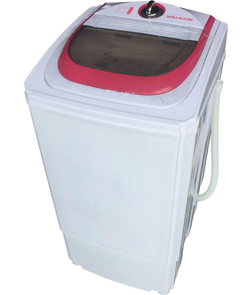 Leinen wird vertikal geladen. Das Gehäuse ist aus strapazierfähigem Kunststoff und hält Belastungen stand. Das Modell ist mit speziellen Rädern ausgestattet, die in der gewünschten Position fixiert werden können.
