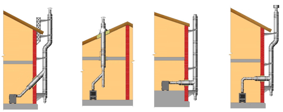Mit Edelstahlgeräten können Rauchgasabzüge in beliebiger Länge, Form, mit Biegungen, Umgehungen und Versetzungen hergestellt werden. Die Schaffung solcher Strukturen ist aufgrund des Vorhandenseins einer breiten Palette von Komponenten möglich: