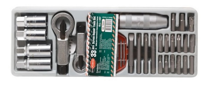 Dieses Set ist äußerst vielseitig und ermöglicht es Ihnen, nicht nur festsitzende Schrauben, sondern auch Stehbolzen zu entfernen. Die Zusammensetzung enthält 25 Elemente, daher kann mit voller Zuversicht argumentiert werden, dass es mit diesem Set möglich ist, jede Situation mit festsitzenden Schrauben zu lösen. Alle Werkzeuge sind auf Basis von langlebigem Chrom-Vanadium gefertigt, was auf eine lange Lebensdauer dieses Sets hinweist. Der Aufbewahrungskoffer enthält separate Fächer für jede Leuchte, und jedes Fach ist mit seiner eigenen Größe gekennzeichnet. Die empfohlenen Kosten für Einzelhandelsketten betragen 6400 Rubel.