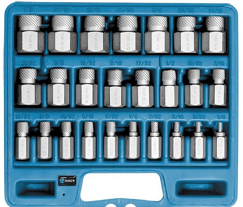 Alle Werkzeuge in diesem Abzieher-Set sind für Linkshänder geeignet, was das Entfernen abgebrochener Schrauben so einfach wie möglich macht und Ihnen ermöglicht, fehlerhafte Befestigungselemente schnell zu beseitigen. Das Set kann mit einer beeindruckenden Liste von Größen von M3 bis M25 arbeiten. Alle Geräte sind aus hochwertigem gehärtetem Stahl gefertigt und haben sich bewährt. Die empfohlenen Kosten für Einzelhandelsketten betragen 380 Rubel.