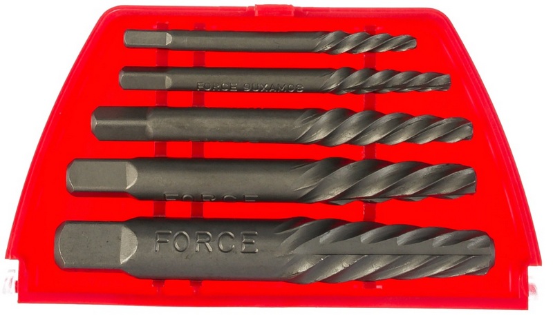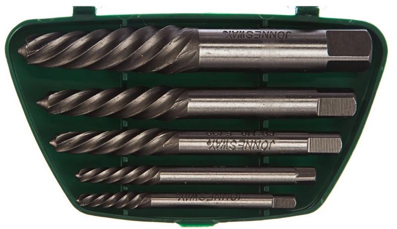 Dieses Kit enthält 5 Halterungen, die aus strapazierfähigem Kohlenstoffstahl gefertigt sind. Dank des hochwertigen Materials, das bei der Konstruktion verwendet wurde, dringen die Auszieher buchstäblich mit ein paar Schlägen in jede festsitzende Schraube ein und lösen sie erfolgreich. Die Werkzeuge haben Linksgewinde. Zur bequemen Aufbewahrung und zum Tragen wird ein Kunststoffkoffer verwendet. Die empfohlenen Kosten für Einzelhandelsketten betragen 680 Rubel.