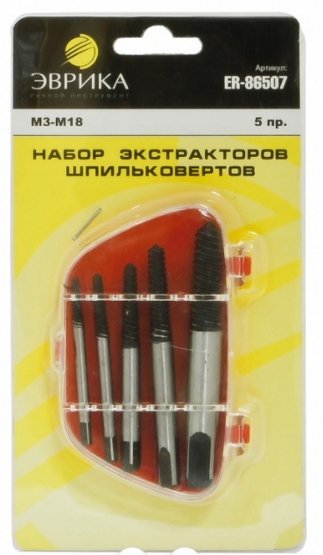Ein guter Werkzeugsatz zum Herausziehen abgebrochener Bolzen, bestehend aus fünf Teilen.Größen von M3 bis M18 werden unterstützt. Alle Komponenten sind in einem kompakten Blister verpackt, um den Transport und die Aufbewahrung zu erleichtern. Bei der Herstellung dieser Ausrüstung wurde standardmäßig gehärteter Stahl verwendet. Das Set ist sehr einfach zu bedienen, womit auch ein Anfänger zurecht kommt. Der Hersteller hat für sein Produkt eine einjährige Garantie festgelegt. Die empfohlenen Kosten für Einzelhandelsketten betragen 285 Rubel.