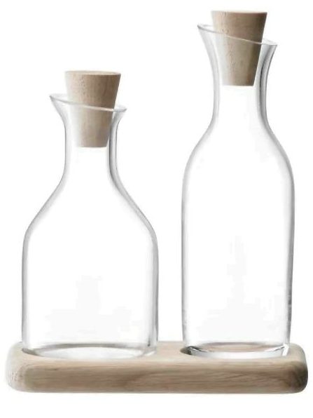 Fein geformte mundgeblasene Glasgefäße eignen sich für jede Art von Servieren. Ein praktischer Erweiterungshals ermöglicht es Ihnen, Gewürze sanft hinzuzufügen, ohne Streifen an den Wänden der Flaschen befürchten zu müssen. Ergänzt wird das Set durch einen eleganten Eichenständer. Das Volumen jeder Karaffe beträgt 300 ml.