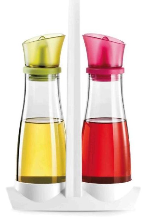 Zwei Behälter aus Borosilikatglas auf einem praktischen Kunststoffständer schmücken jede Küche. Die Spender sind aus strapazierfähigem Kunststoff in leuchtenden Farben. Das Volumen jeder Flasche beträgt 250 ml. Alle anderen flüssigen Gewürze können im Set aufbewahrt werden.