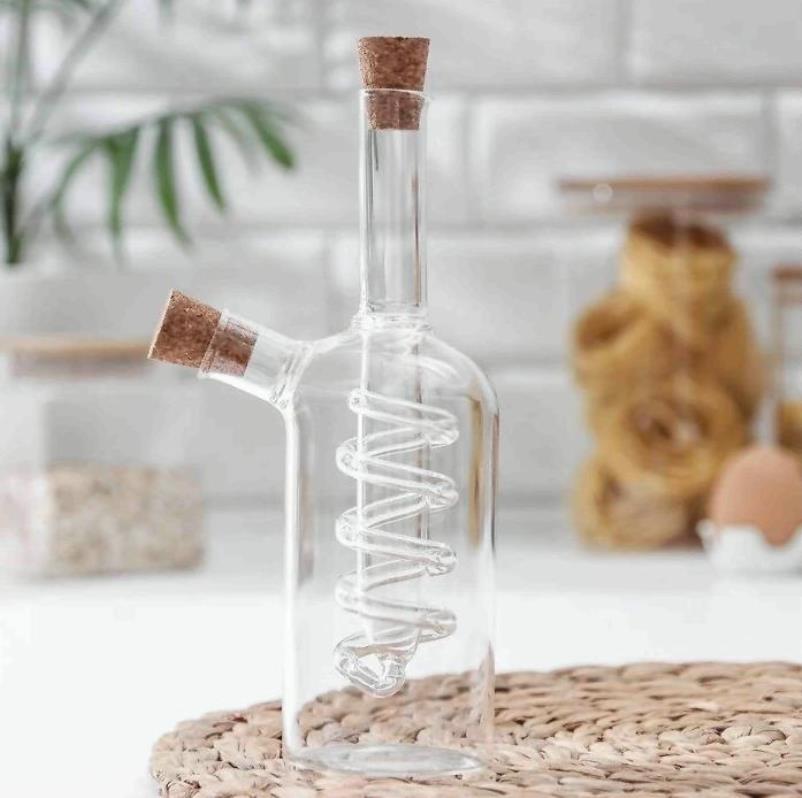 Eine Flasche mit originellem Design wird nicht nur auf einem heimischen Esstisch, sondern auch in einem teuren Restaurant großartig aussehen. Das Volumen eines großen Gefäßes beträgt 250 ml, ein kleines hinter der Spirale 30 ml. Die Flasche besteht aus strapazierfähigem Glas, der Korken aus Holz.