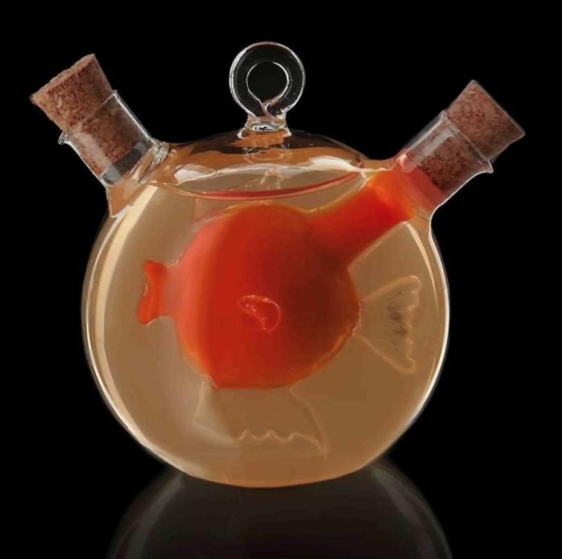 Eine originelle Flasche mit einem zweiten Behälter in Form eines Fisches im Inneren wird zu einer echten Dekoration des Tisches. Wenn Sie mit Gewürzen in verschiedenen Farben experimentieren, können Sie verschiedene interessante Kompositionen erstellen. Die Flasche besteht aus strapazierfähigem Glas, der Korken aus Holz. Das Volumen einer großen Flasche beträgt 420 ml, Fisch - 50 ml. Größe - 12,4 x 10 x 12 cm.