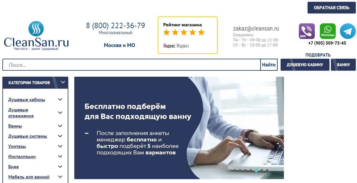 Cleansan.ru ist seit mehr als 4 Jahren auf dem Markt. Für seine Arbeit und die Kundenorientierung erhielt das Geschäft eine Bewertung von 4,8 auf Yandex Market. Die Seite ist informativ: Kontaktinformationen für die Kommunikation mit Beratern, ein Suchfeld, ein Katalog befinden sich auf der ersten Seite.Es gibt ein Pop-up-Fenster für die Online-Beratung mit einem Spezialisten, die Kommunikation über Instant Messenger ist möglich. Der Online-Shop arbeitet mit einer breiten Palette von Sanitärprodukten: Duschkabinen, Badewannen, Bidets, Toilettenschüsseln, Wasserhähne usw. Hervorheben möchte ich eine große Auswahl an Duschkabinen mit verschiedenen Konfigurationen und Funktionen: mit Badewanne, Badewanne, Hydromassage . Darüber hinaus umfasst das Sortiment Saunen, Hydromassage-Pools. Alle diese Produkte werden von mehr als 30 Herstellern bezogen. Alle Produkte haben ein klares Foto mit einer detaillierten Beschreibung und Angabe der Gesamtabmessungen.