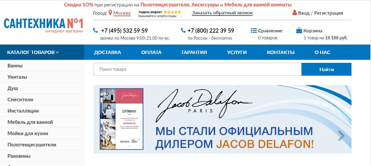 The Plumbing Company ist seit mehr als 9 Jahren hier und hat in dieser Zeit eine ziemlich hohe Bewertung unter seinen Konkurrenten erhalten (4,6 im Yandex Market). Auf den ersten Blick auf die Seite der Website des Geschäfts ist klar, dass alles für die Bequemlichkeit eines potenziellen Käufers getan wurde.Kontakte für die Kommunikation mit Managern, ein Suchfeld, ein Katalog sowie Registerkarten (Zahlung, Lieferung, Installation usw.) befinden sich oben auf der Seite. Das Fenster für die Online-Kommunikation mit den Betreibern ist aktiv und, was schön ist, es erscheint nicht von selbst und stört nicht die Anzeige von Informationen.