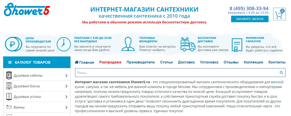 Shower5.ru ist ein spezialisierter Online-Shop für Sanitärinstallationen. Es ist seit mehr als 7 Jahren in Betrieb. Der erste Eindruck ist durchaus positiv: Alle Informationen, die für einen potenziellen Kunden wichtig sind, befinden sich in der Sichtbarkeitszone, periodisch erscheint ein Fenster zur Online-Beratung, die Suchleiste ist gut sichtbar, die Katalogstruktur ist intuitiv. Das Geschäft arbeitet direkt mit einer großen Anzahl von Herstellern (mehr als 50) zusammen, wodurch es erschwingliche Preise bietet. Unter den angebotenen Waren befinden sich Duschkabinen, Kästen und Ecken, Badewannen in verschiedenen Größen und Konfigurationen, Duschsysteme, Waschbecken, Toilettenschüsseln, Wasserhähne, Warmwasserbereiter. Neben Sanitärprodukten bietet Shower5 Badmöbel und Accessoires, Türen und Trennwände.