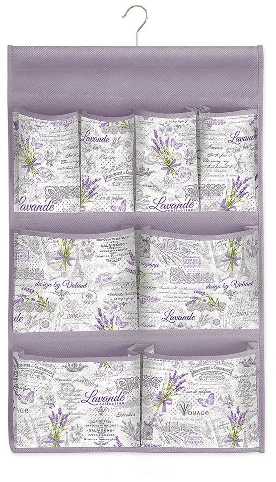 Lavande Garderobenkoffer wird nicht nur eine schöne und funktionale Ergänzung zum Interieur im Provence-Stil sein. Hängetaschen haben ein ästhetisches Design und ermöglichen es Ihnen, viele kleine Accessoires, einschließlich kosmetischer Accessoires, richtig zu verstauen. Das Set enthält 4 Taschen mittlerer Größe und 4 sehr kleine.
