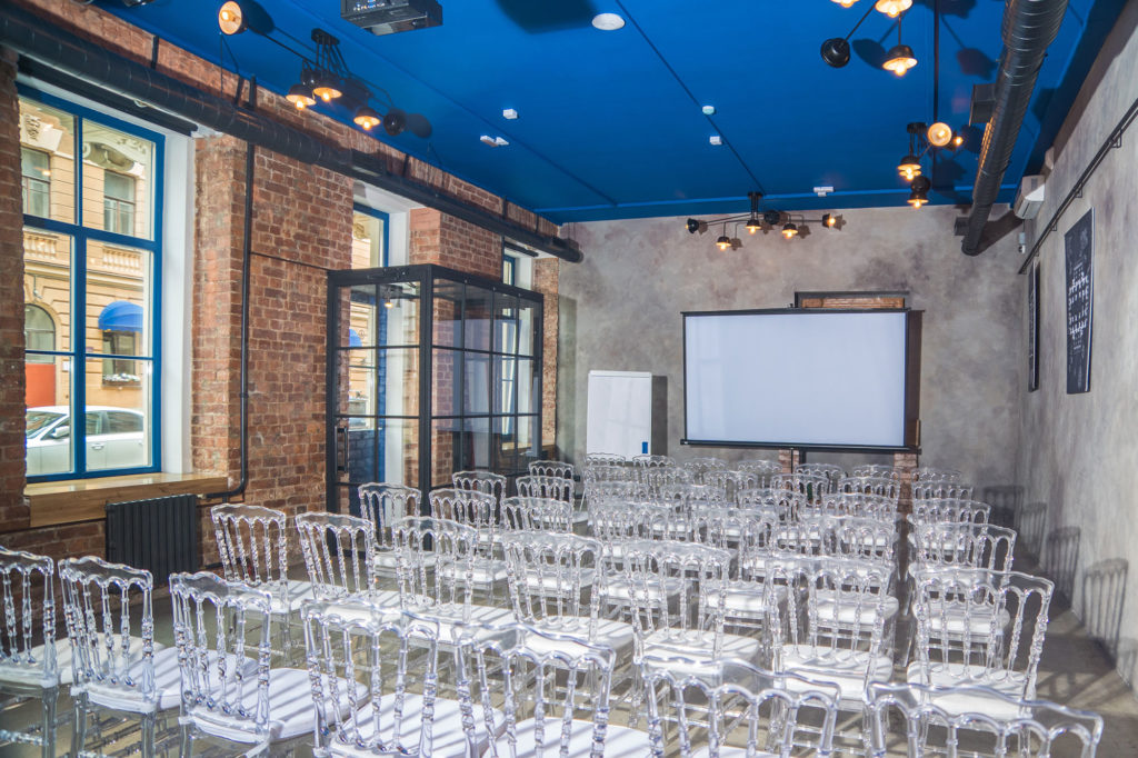 Der Hörsaal ist ein Raum mit hohen Decken, ein ungewöhnliches Design im Loft-Stil, die Fläche des Saals beträgt 400 qm. m, mit einer Kapazität von 70 Personen.