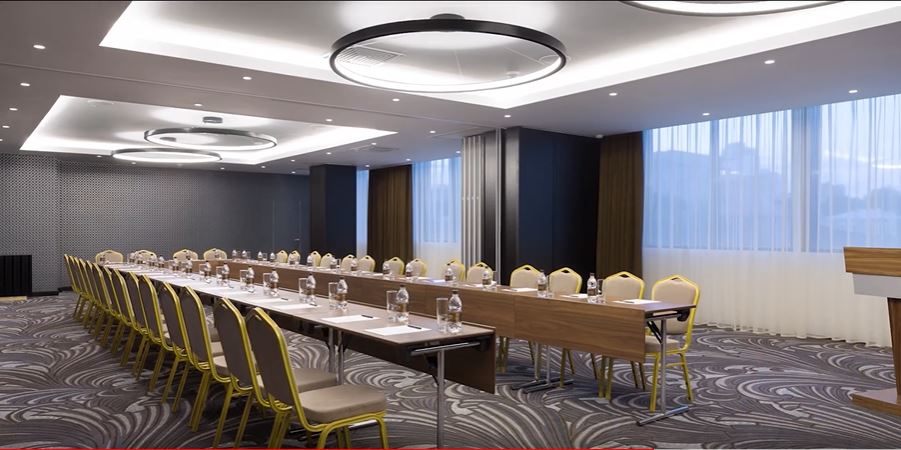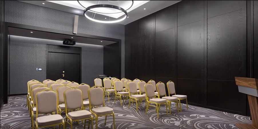 Das Fünf-Sterne-Hotel stattete die Räumlichkeiten mit schickem Design und hochwertigen Möbeln aus. Die hellen Farben der Einrichtung werden durch die Vergoldung bequemer Stühle aufgeweicht. Der Saal ist mit schicken Designer-Kronleuchtern geschmückt. Hochwertige Beleuchtung sorgt für einen angenehmen Aufenthalt für Zuschauer und Teilnehmer.