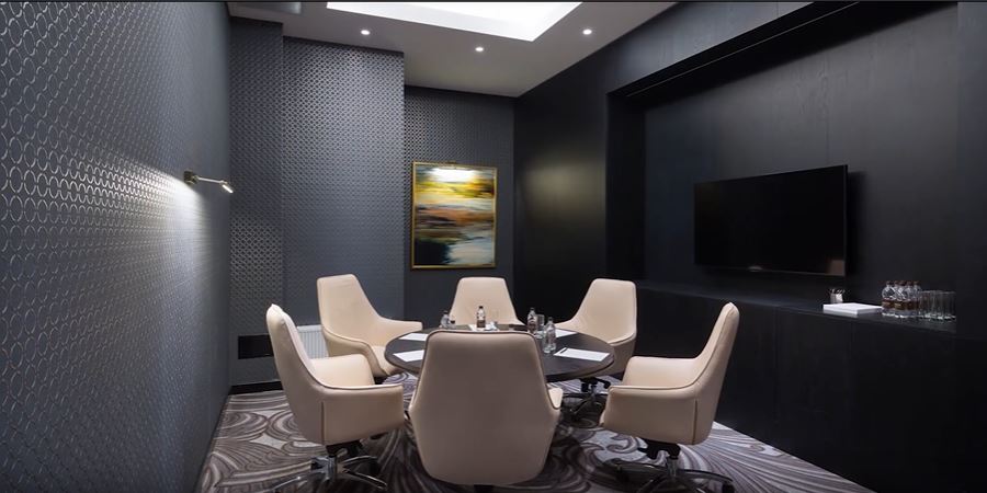 Die Größe des Verhandlungsraums beträgt 26 m2, die Kapazität beträgt bis zu 8 Personen. Großartige Budgetoption für ein kleines Meeting. Das Büro ist ziemlich dunkel. Es gibt einen Ausgang zum Balkon.