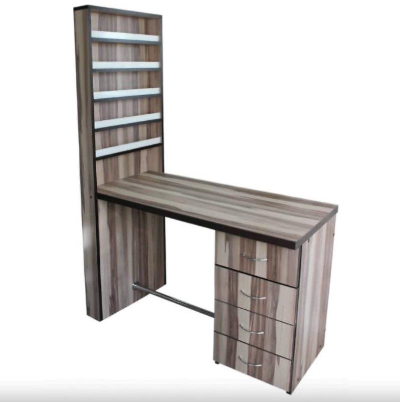 Dieses Modell ist in einer Vielzahl von Farboptionen sowohl mit Holz- als auch mit Kunststoffbeschichtung erhältlich. Hergestellt aus Spanplatten. Vier praktische ausziehbare Schubladen werden durch einen offenen Schrank mit Regalen ergänzt. Hat eine Fußstütze. Bequem für den Meister und den Kunden.Größe 110 x 50 x 73 cm.
