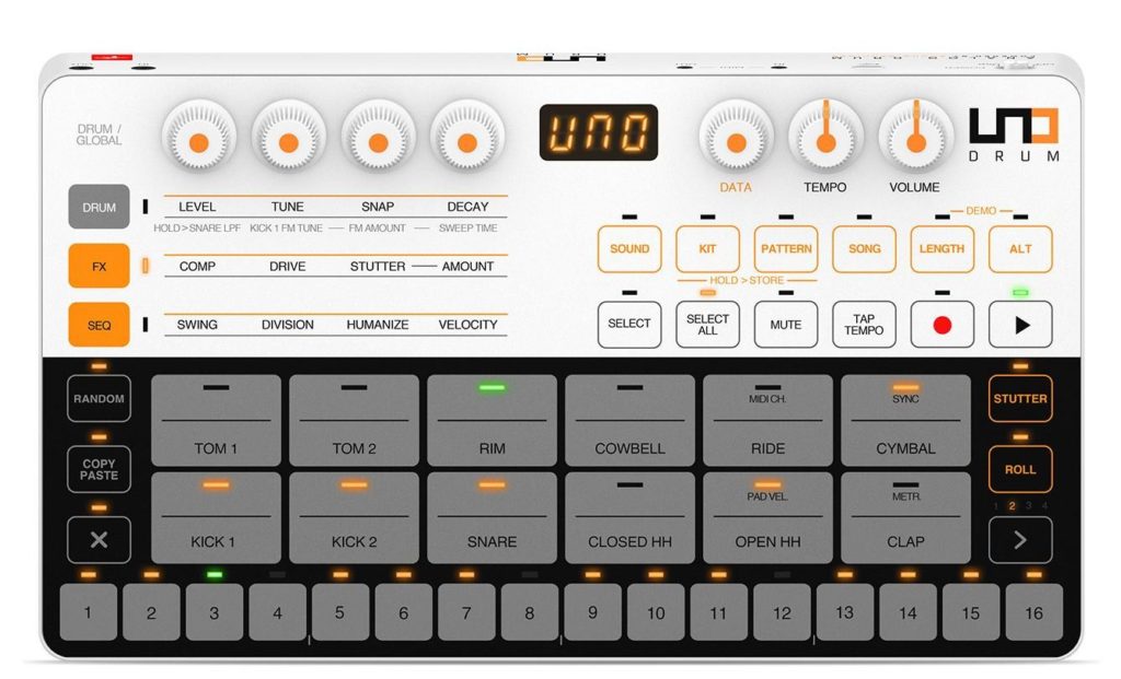 Ein Feature der Drum Machine ist ein 64-Schritt-Sequenzer.Das Gerät ist in einem Metallgehäuse untergebracht, sodass es regelmäßig ohne Beschädigungsrisiko transportiert werden kann. Alle Tasten auf dem Gerät sind für eine bestimmte Funktion verantwortlich, sodass Benutzer das Menü nicht herunterladen müssen. Dieses Design ist für Benutzer geeignet, die gerade erst anfangen, in diesem Bereich zu arbeiten.