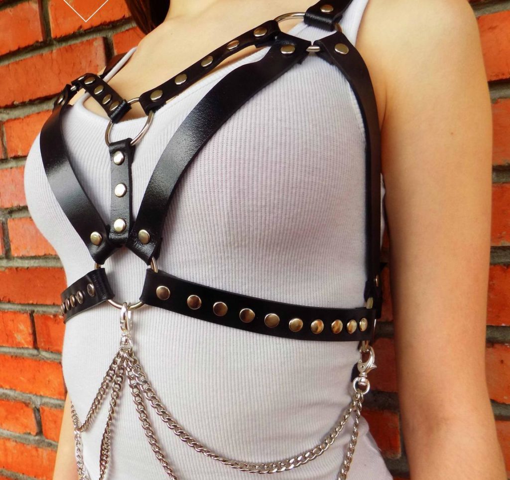 Es besteht aus breiten Bändern, die ineinander verschlungen sind. Die Gürtel sind mit kleinen Nieten und Ringen verziert. Das Accessoire sieht gut aus mit Hosen und einem strengen Kleid. Wird die perfekte Ergänzung für mutige Mädchen sein. Die Träger sind je nach Brustumfang und individuellen Eigenschaften der Figur verstellbar.