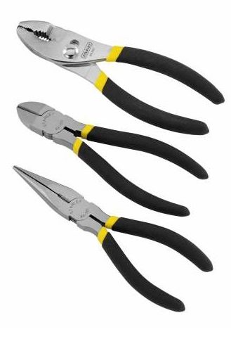 Ein preisgünstiges Set aus Zangen und Drahtschneidern, geeignet für Heimarbeit, professionellen Gebrauch, einschließlich Kontakt mit dünnem, mitteldickem Metall. Das Kit enthält: Drahtschneider 10 cm x 5 cm x 1 cm; Zange 10 cm x 5,5 cm x 1 cm; Zange mit kurzen Backen zum Klemmen, Brechen von Kleinteilen 15 cm x 5 cm x 1 cm Nicht geeignet für Arbeiten unter Spannung.Der Griff fühlt sich angenehm an und ist mit schwarzem Gummi überzogen. Preis: 919 Rubel für 3 Artikel.