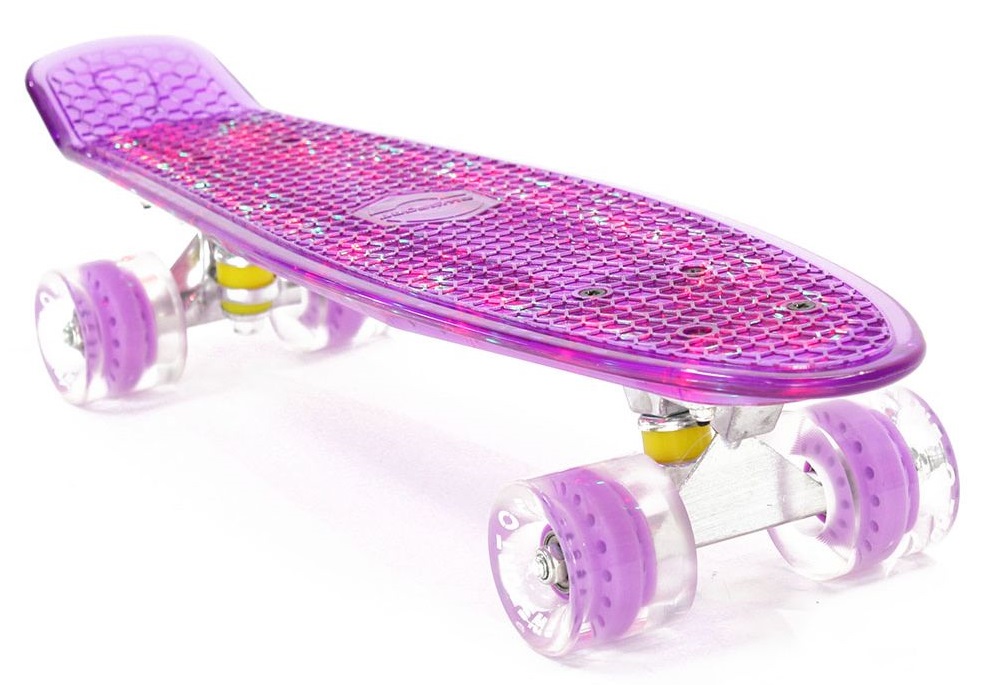 Dieses ungewöhnliche Skateboard wird sowohl "große" Mädchen als auch "kleine" interessieren. Sein Hauptmerkmal ist das Vorhandensein einer LED-Hintergrundbeleuchtung (mit mehreren Modi), die über ein USB-Kabel aufgeladen wird. Polyurethan-Räder und hochwertige Lager machen es möglich, das Beste aus dem Fahren herauszuholen.Fugen und Fehlstellen im Fahrbahnbelag sind während der Fahrt fast nicht zu spüren. Bushings (Dichtungsgummibänder) sind aus Polyurethan mit mittlerer Steifigkeit, was die Kontrolle des Cruisers erleichtert.