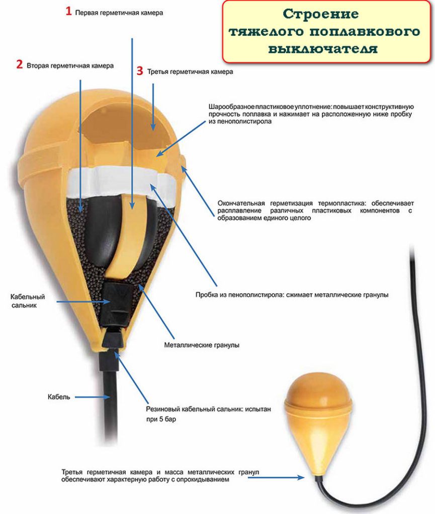 An sich ist der Aufbau des Schwimmerschalters recht elementar. Im Inneren des Gehäuses aus hochfestem, hitzebeständigem Kunststoff ist ein funktionierender elektrischer Schalter untergebracht. In der Nähe befindet sich ein Hebel zum Bewegen der Kontakte im Schalter und eine Stahlkugel, die für die Position des Hebelelements während der Positionsänderung des Schwimmers selbst verantwortlich ist.
