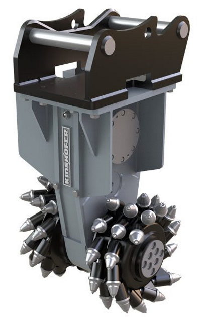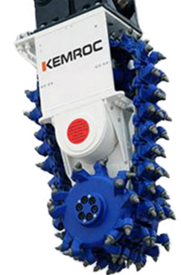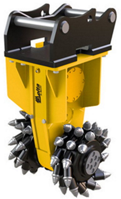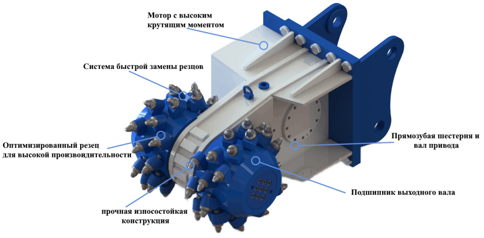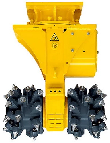 Modellreihe für Bagger von zwei bis 50 Tonnen zum Fräsen von Gestein mit einer Druckfestigkeit von bis zu 100 MPa. Es zeigt eine hohe Effizienz unter Bedingungen, bei denen Bohren und Sprengen für die Gewinnung von mittelhartem Gestein mit einer Druckfestigkeit von 15 bis 60 MPa nicht möglich sind.