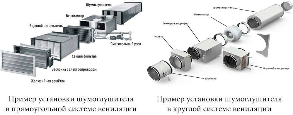 Für Haushaltslüftungssysteme sind universelle kleine Modelle von Schalldämpfern besser geeignet.Die Installation erfolgt am besten an einem Ort, der zwei Anforderungen sofort erfüllt: die Verfügbarkeit der Installation und den höchsten Pegel an Stromgeräuschen.