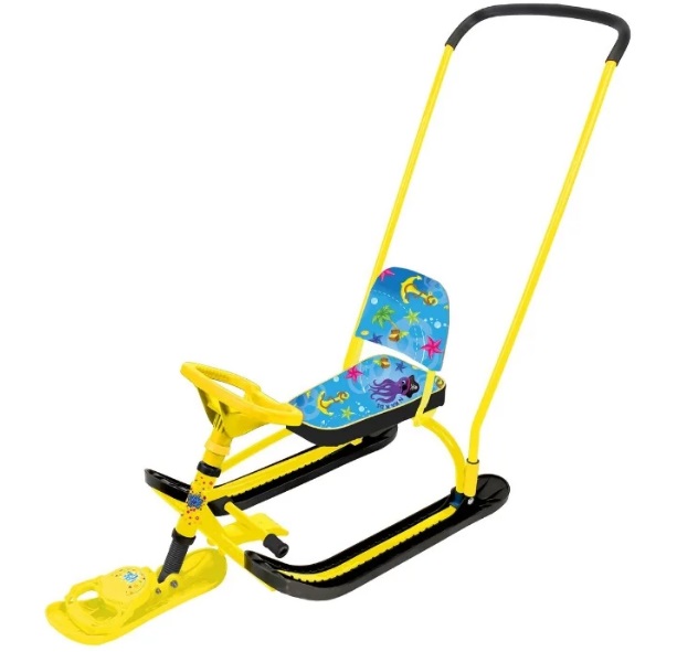 Der Hauptvorteil eines solchen Transports ist also die Manövrierfähigkeit und Sicherheit. Wenn Sie mit Hilfe des Lenkrads den Hügel hinunterrollen, kann das Baby das Hindernis umgehen oder zum richtigen Zeitpunkt langsamer werden. Und durch den weichen Sitz ist nicht nur Komfort, sondern auch eine gute Dämpfung gewährleistet. Vergessen Sie auch nicht die gesundheitlichen Vorteile.Durch ständiges Fahren auf einem Schneescooter lernt das Baby, das Gleichgewicht zu halten, Muskeln zu stärken und Geschicklichkeit zu entwickeln. Aber für eine souveräne Kontrolle muss man ein wenig arbeiten.