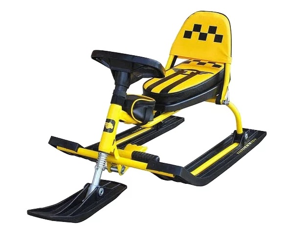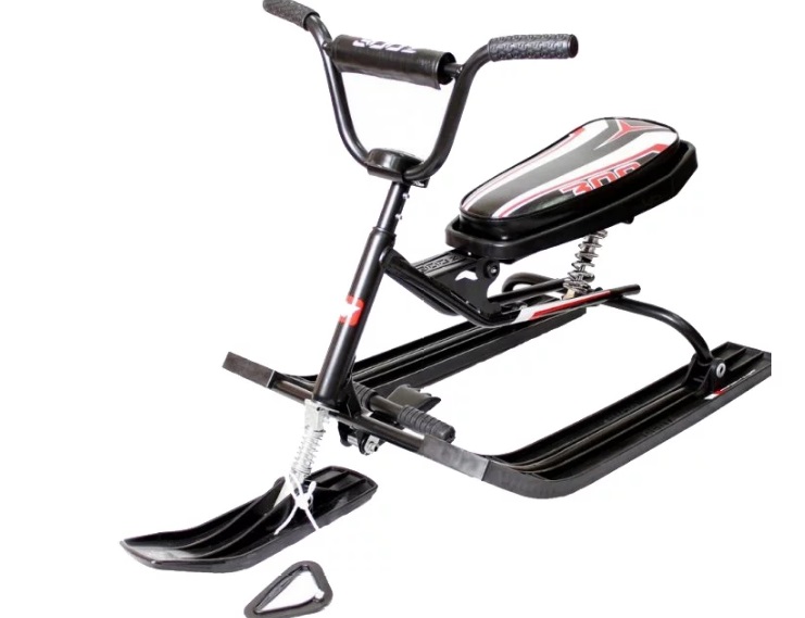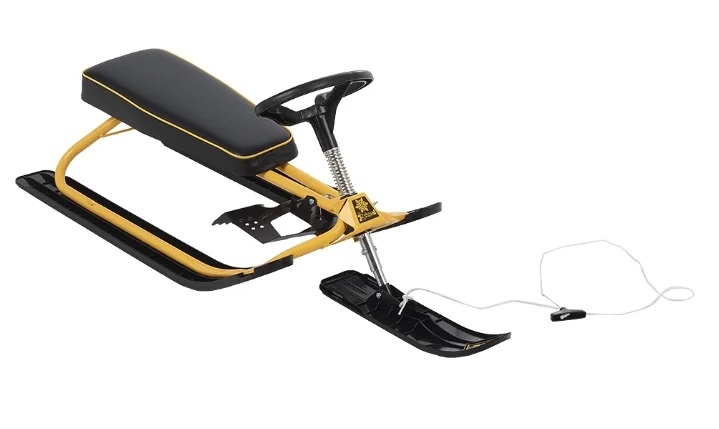 Eine solche Einheit kombiniert konstruktionsbedingt ein Schneemobil und herkömmliche Schlitten. Auf dem Rahmen des Schneescooters befinden sich ein weicher Sitz sowie Kufen, die wie Skier aussehen. Normalerweise installieren die Hersteller drei Kufen, von denen zwei zum Geradeausfahren und die dritte zum Wenden verwendet werden. Und zur bequemen Steuerung gibt es ein Lenkrad und eine Bremse. Es ist auch möglich, ein spezielles Kabel zu installieren.