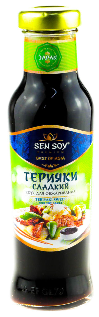 Teriyaki hat einen charakteristischen süß-sauren Geschmack, der nach einem traditionellen Rezept zubereitet wird.Das in Japan beliebte alkoholarme Getränk Mirin auf Reisbasis, das Teil des Dressings ist, verleiht der Sauce eine besondere Geschmackspalette.