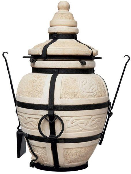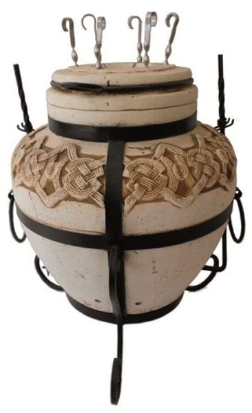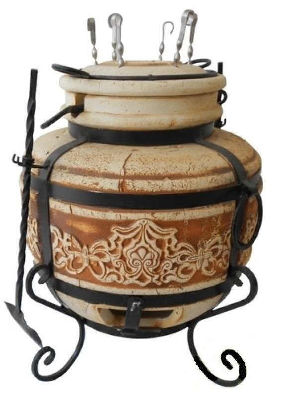 Öffnet den oberen 8-Ofen - Bestpohod Eastern Large Tandoor. Die Körperwand ist 5 mm dick und besteht aus umweltfreundlichem Ton.Im Inneren können Temperaturen bis zu 1200 Grad gehalten werden. Das anmutige Aussehen passt den Tandoor in jedes schöne Interieur. Auf dem Körper sind Felgen mit Griffen. Unten ist ein Ständer mit drei Beinen installiert, die den Ofen über den Boden heben und ihn vor Feuchtigkeit schützen.