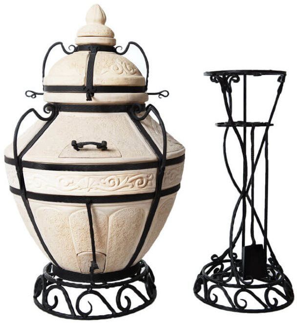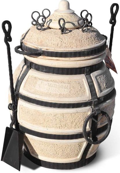 Eine kleine Ofenbrause der Marke Amphora hilft Ihnen beim Kochen von Fisch, Fleisch, Backen von Gemüse und Backen von Mehlgebäck. Ähnlich wie beim Vorgängermodell.Höhe 63 cm, ohne Deckel - 44 cm, Körperdurchmesser 45 cm, Hals - 22 cm Das Kit enthält 8 Spieße und eine Vorrichtung zum Aufhängen, einen Schürhaken mit Schaufel, einen Rost. Der Ofen kann als Geschenk für Verwandte und Freunde erworben werden. Es ist mobil, wiegt nur 50 kg. Darunter befindet sich ein Gebläse. Metallschmiedebeschläge verlängern die Lebensdauer des Produkts und schützen den Körper vor Rissen. Es dient auch als Dekoration für das Erscheinungsbild des Kohlenbeckens. An den Seiten befinden sich Ringe, um den Tandoor bei Bedarf zu tragen. Der Anführer unserer Bewertung von Tandoor zum Geben.