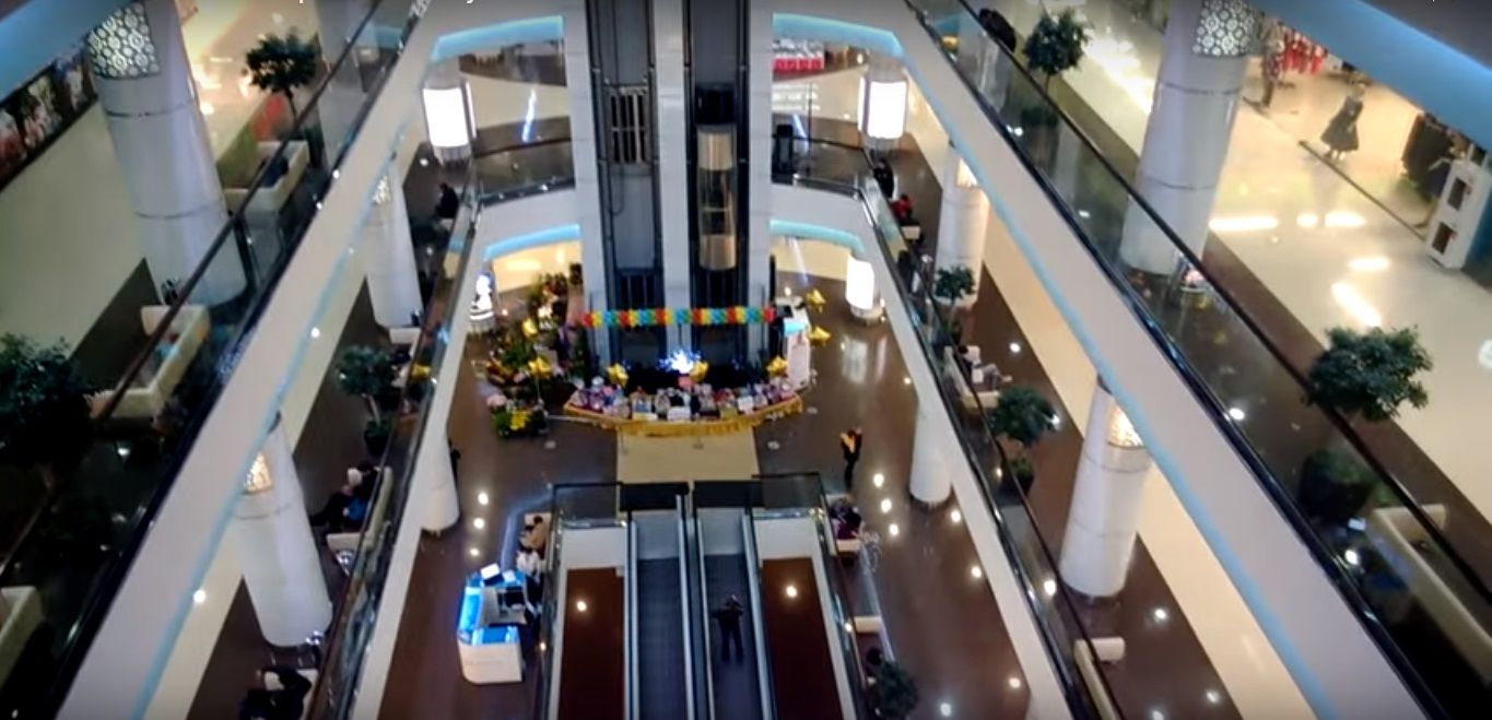 Viele Besucher bewundern das ungewöhnliche Dach des Gebäudes - es hat die Form einer Kuppel, durch die man den Himmel sehen kann. Auf der obersten Etage befindet sich ein Erholungsgebiet - ein Kino mit 10 Sälen und ein Food-Court-Bereich.