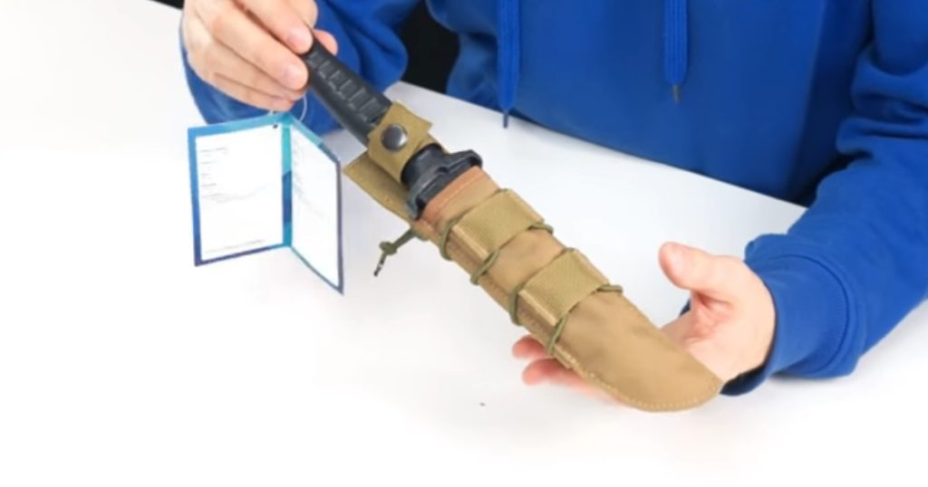 Der Hauptteil der Abdeckung muss aus einem einzigen Materialstück bestehen. Es ist wichtig, dass das Produkt den Schnittbereich gut abdeckt. Die beste Wahl wäre eine kleine Scheide, die zur Ausrüstung passt. Nur so kann eine sichere Lagerung gewährleistet werden.