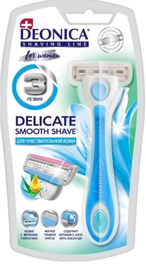 Dieser Rasierer hat 3 Klingen, die eine komfortable Haarentfernung ermöglichen. Die Schneidteile dieses Modells haben eine doppelte Keramikbeschichtung, dank der das Produkt lange seine Schärfe behält. Dieses Modell ist auch für empfindliche Haut geeignet, nach dem Gebrauch treten keine Reizungen und Beschwerden auf. Der Gelstreifen bei Deonica 3 für Frauen ist mit Aloe, Sheabutter und Vitamin E imprägniert. Dadurch gleitet der Rasierer leicht über die Haut und schneidet die Haare ab. Der Griff des Rasierers besteht aus Kunststoff und hat Gummieinlagen, wodurch das Produkt angenehm in der Hand liegt und dabei nicht herausrutscht.