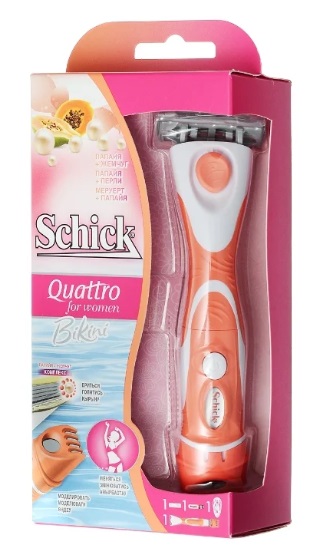 Dieses Produkt der amerikanischen Marke „Schick“ ist speziell für die Bikinizone konzipiert. Das Produkt hat vier Klingen, die aus Edelstahl gefertigt sind. Um die Haut vor Schnitten oder Kratzern zu schützen, hat der Hersteller ein spezielles Schutzgitter vorgesehen. Zum Modellieren der Bikinizone gibt es einen wasserfesten Trimmer. Der Trimmer verfügt über einen verstellbaren Kamm, der bequem zu bedienen ist. Für besseres Gleiten gibt es einen Feuchtigkeitsstreifen, der mit Jojobaöl und Acai-Beeren getränkt ist.Der Schick Lady Quattro Bikini benötigt zum Betrieb Batterien, die nicht im Lieferumfang enthalten sind.