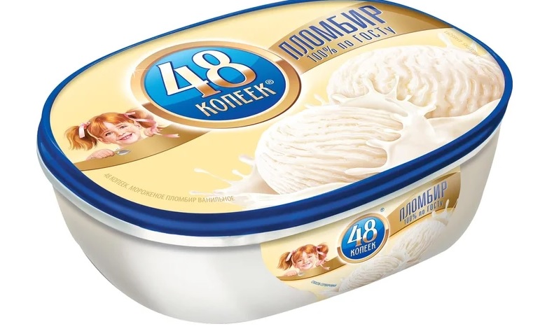 Dieses Eis ist in Plastikbechern, Portionspackungen oder Bechern erhältlich. Das Gewicht des Eises in der Wanne beträgt 450 Gramm. 100 Gramm des Produkts enthalten 221 kcal. Der Fettgehalt von "48 Kopeken" beträgt 10,2%.