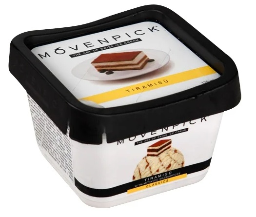Mövenpick Tiramisu wird in einem Plastikeimer geliefert. Sein Gewicht beträgt 810 Gramm. 100 Gramm des Produkts enthalten 147 kcal. Der Fettgehalt des Produkts beträgt 15,5 %
