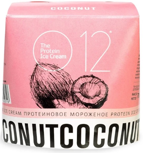 "O12 coconut" hat eine Papierverpackung, das Gewicht einer Portion beträgt 70 Gramm. 100 solcher Eiscreme enthalten 136 kcal.