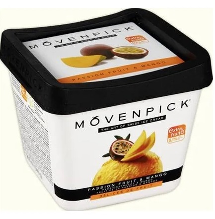 Movenpick Mango Passion Fruit wird in einem Plastikbehälter geliefert und wiegt 900 Gramm.100 Gramm des Produkts enthalten 132 kcal und der Fettgehalt beträgt 0,2 %.
