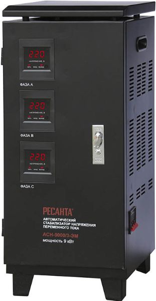 Ein Modell zur Stabilisierung des Stromnetzes, dessen Spannung von 140 bis 260 V bis zum Optimum von 220 V reicht. Die Ungenauigkeit dieser Geräteserie übersteigt 2 Prozent nicht. Das Gerät ist bis 10 kW belastbar. Haushaltsgeräte werden über die Klemmen an den Stabilisator angeschlossen.