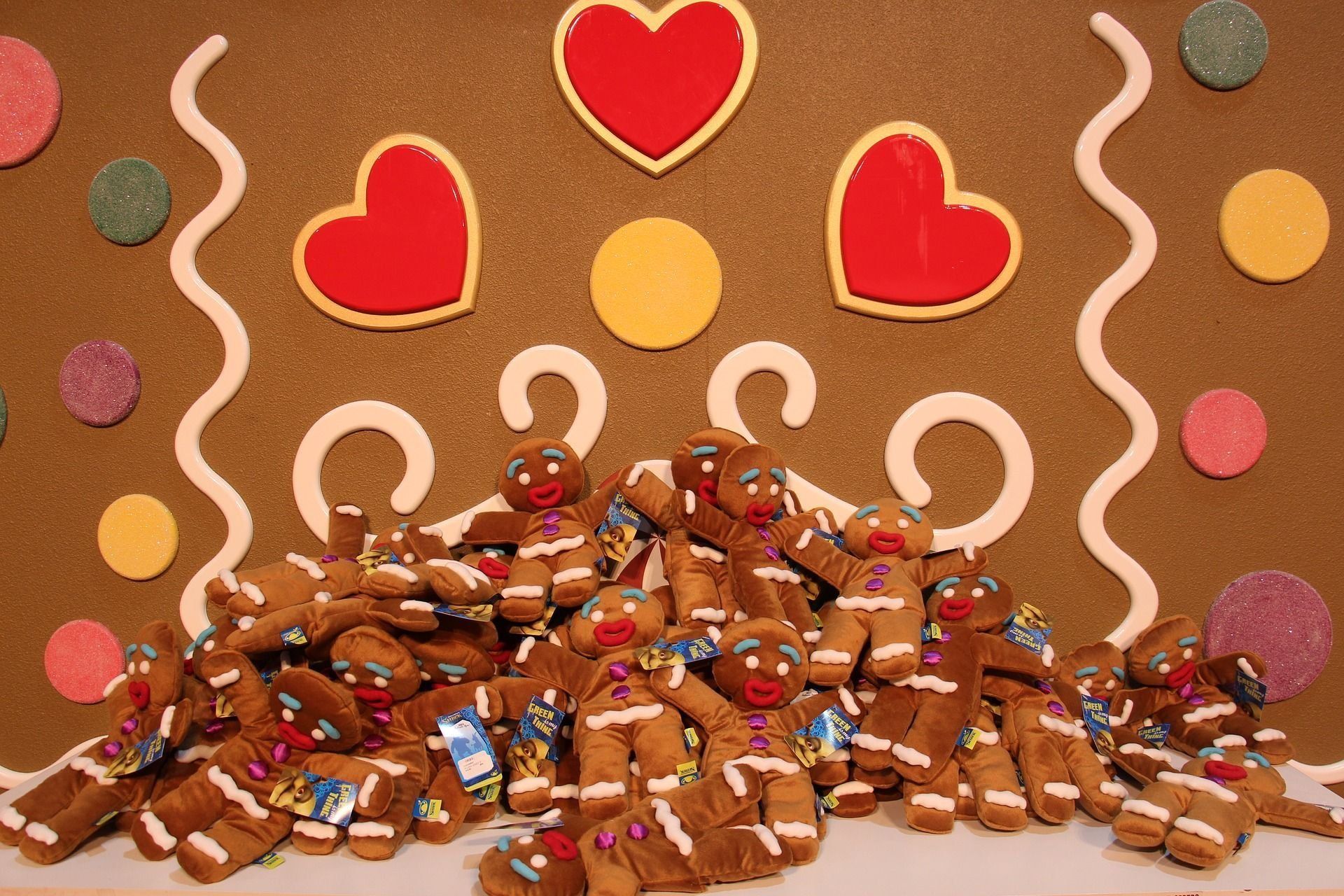 Mehrstöckige Konditoreigebäude und Schokoladenbrunnen nehmen den Hintergrund der Komposition ein, Vasen und Teller auf Beinen folgen näher. Der erste Plan ist mit Tabletts und Tabletts in allen Größen und Formen belegt.