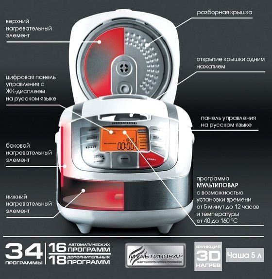 Η μονάδα σε αυτόματη λειτουργία ετοιμάζει ζυμαρικά, ζύμη, γιαούρτι, βραστά, πατάτες, ατμούς. Η αυτόματη θέρμανση μπορεί να απενεργοποιηθεί για εξοικονόμηση χρημάτων. Η λειτουργία «καθυστερημένης εκκίνησης» έχει οπισθοδρόμηση 24 ωρών. Υπάρχει ένα μπιπ που μπορεί να ρυθμιστεί και να απενεργοποιηθεί. Το ευρύχωρο μπολ (5 l) καλύπτεται με αντικολλητικό κεραμικό. Ισχύς μηχανής - 860 Watt. Συνοδεύεται από ένα βιβλίο συνταγών. Και όλα κοστίζουν λιγότερο από πέντε χιλιάδες!