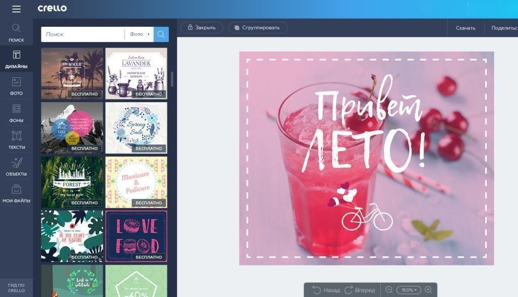 Another free photo editing tool is Crello. In some ways, it is very similar to the Canva product described above. Both utilities are designed to be assistants in the design direction. Crello is easy to learn and can be mastered in 20 minutes. Users are provided with a wide selection of templates, from which an appetizing candy is created to their taste. For Instagram, it’s better to choose a 800 x 800 image format, otherwise rectangular frames will be cropped.
