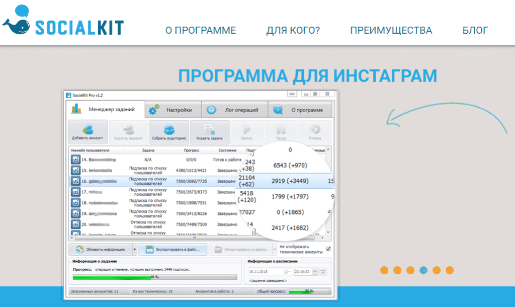 Useful software for promoting on Instagram will be the SocialKit program. Access comes in two variations: Demo version and Pro. As for the Demo, then everything is clear. This is a free option to get acquainted with the application and its functionality. Unfortunately, during the acquaintance there will be no various opportunities, access is limited and only for a week.The full picture of the program can be intimidating at first, as the manual is impressive, but once you get the hang of it, you'll start to benefit from SocialKit. The application has a lot of possibilities, the most interesting ones are a parser that collects databases (it is oriented by geolocation, hashtags and competitor profiles), advanced filtering, blocking subscribers, auto-posting, auto-likes, transaction log, captcha recognition and SMS from Instagram. There is a forum, training materials and technical support.