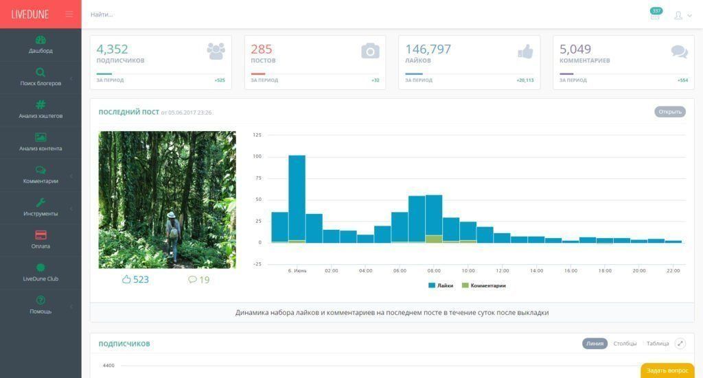 For a detailed study of statistics on Instagram, the livedune app is perfect. This service is suitable for bloggers, smm agencies and for doing business. You just have to choose one of three tariffs. What does it give? With its help, you can study detailed statistics of your own (for bloggers) and other people's accounts (for smm agencies and businesses), participation in thematic ratings, search for people to cooperate with, attract advertisers, etc. It is this program that allows you to check bloggers for cheating, to see how many live contingents they have in subscriptions. There is a free trial period.
