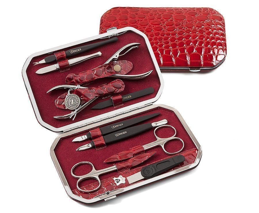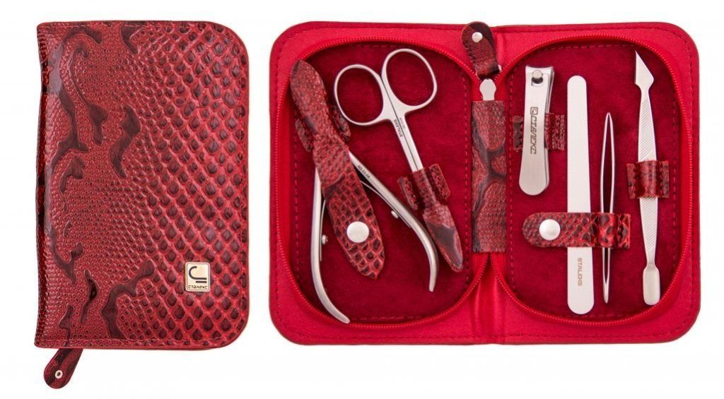 For manicure, the MS-FC804-S model from the popular ZINGER company is perfect. The package includes 10 items: three pushers of various shapes, a trimmer, a diamond nail file, nail scissors, nail clippers, beveled tweezers, cuticle scissors and pedicure nippers. All items of the manicure set are impeccably made and can last for many years. The elegant red case, crafted from genuine leather, has an elegant design and excellent quality. This professional set is suitable for both experts in their field and beginners. You can do both classic manicure and pedicure.